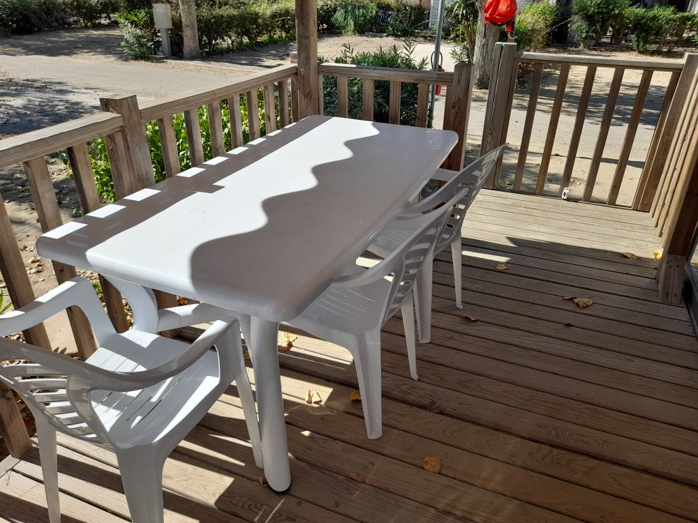 Terrasse intégrée équipé d’un salon de jardin et d'une plancha à gaz.